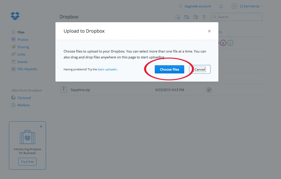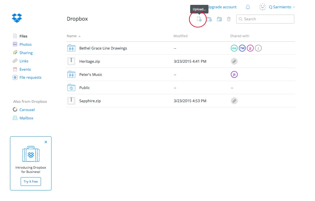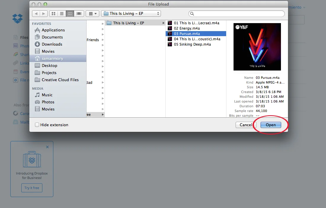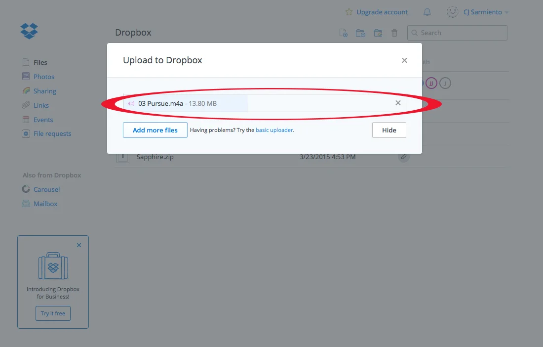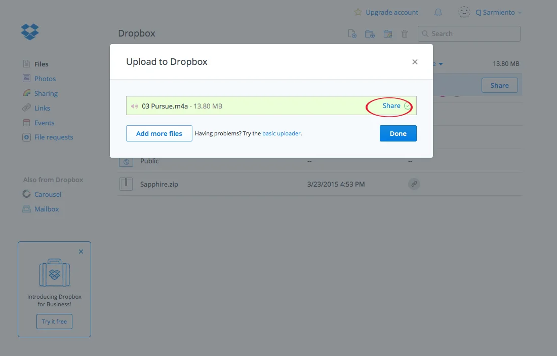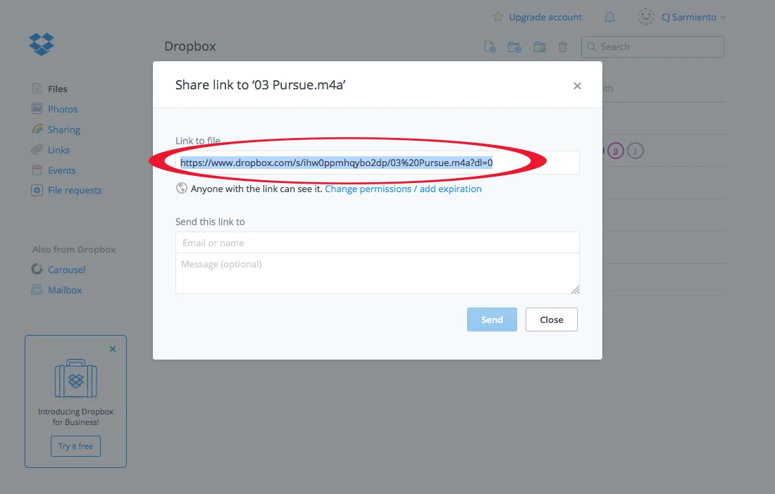 Inicia una sesión en tu cuenta de Drop Box o solicita una cuenta gratuita aquí. Sube la canción (mp3/mp4) que necesita editar de tu computadora y luego comparte el enlace con nosotros. (Log in to your Drop Box account or sign up for a free account here. Upload your mp3 then share the link with us.)