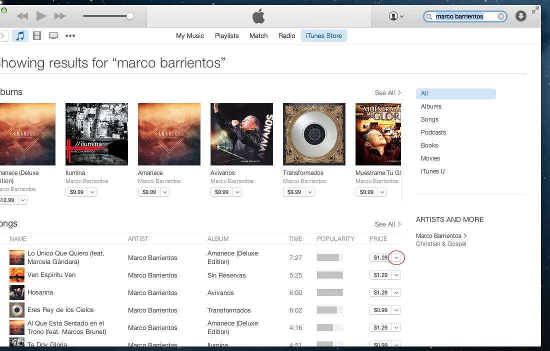 Step 3: Locate your song and click on the drop down menu to the far right, the arrow next to the cost of your song ($0.99 or $1.29).