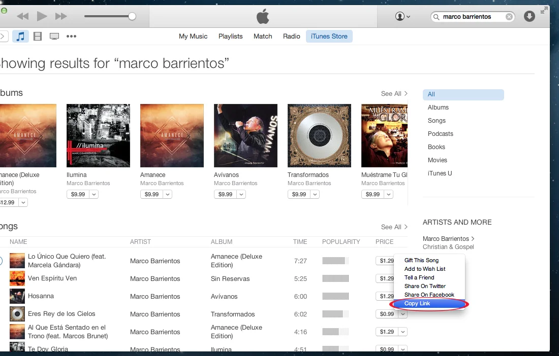 Abre tu tienda de iTunes a través del app o en linea. Busca tu canción usando la lista de artistas, luego comparte el enlace con nosotros.